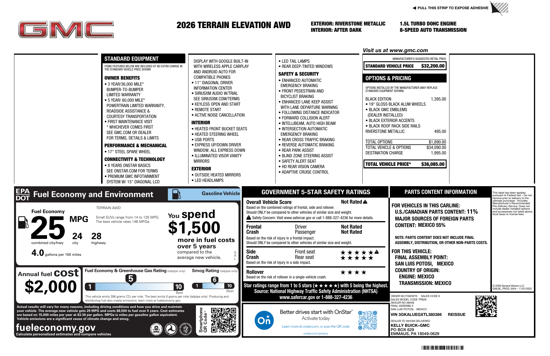 Meet the 2026 GMC Terrain — the compact SUV that blends confidence, comfort and peace of mind. With standard AWD, run-flat tires and a limited-slip differential, it’s ready for whatever the road (or weather) throws at you; advanced braking and stability systems — ABS, electronic brake assist, traction control and stability control — keep you firmly in command. You’ll appreciate family-friendly safety like multiple airbags, child safety door locks and an anti-theft system tied into braking/traction, plus convenience features such as keyless entry, remote start with climate control, heated front seats and heated steering wheel. Spacious seating for five, thoughtful tech and a strong warranty package (3/36 basic, 5/60 powertrain, 6/100 rust) make the Terrain a smart, worry-free choice. Stop by for a test drive today and experience it for yourself.